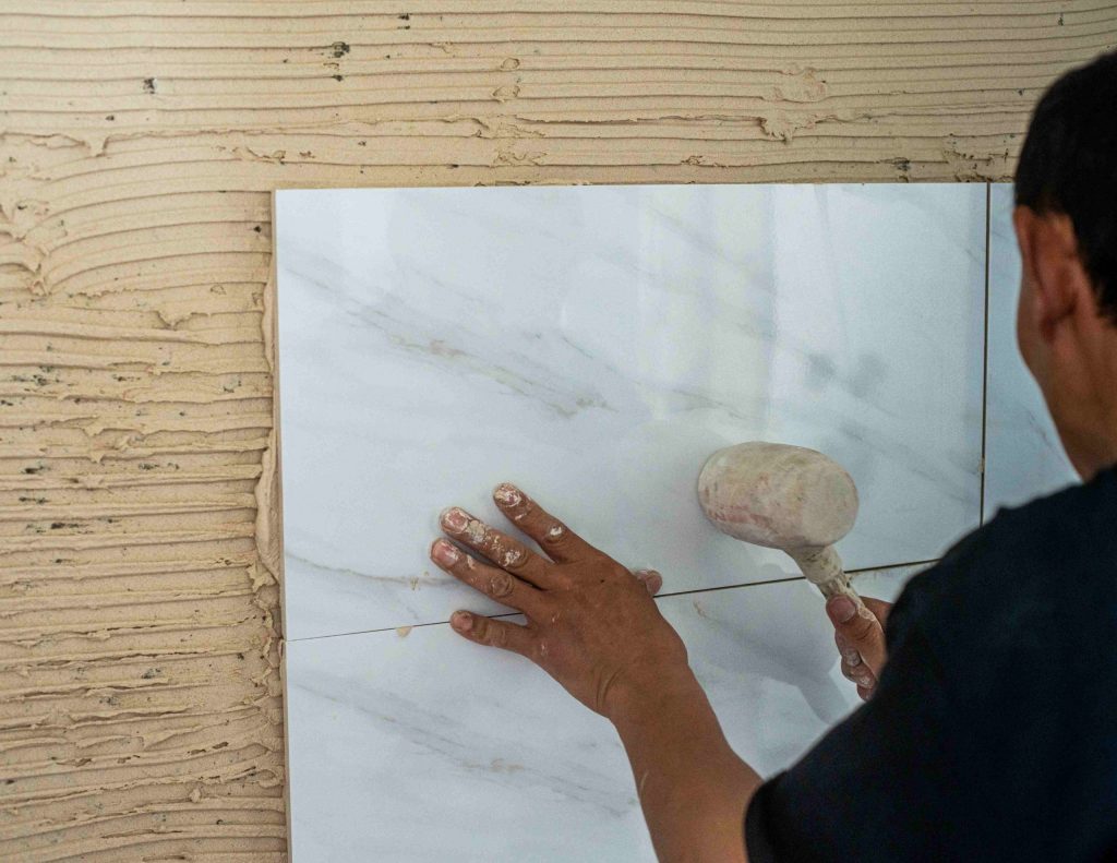 Het daadwerkelijke snijden van deze ingewikkelde patronen is het moment waarop het werkelijke vakmanschap van ons team naar voren komt. Bij een visgraatpatroon moet werkelijk elke hoek tot op de graad nauwkeurig kloppen: als je aan het begin van de kamer slechts één millimeter afwijkt, resulteert dit aan het einde van de woonkamer in een gapend gat van meerdere centimeters. Het is een voortdurende kettingreactie van precisie waarbij concentratie vereist is. Ik maak hiervoor standaard gebruik van een professionele watergezaagde machine om de snijranden zo snaarstrak mogelijk te krijgen zonder splinters of kartels. Bij handgebakken tegels mag het resultaat visueel misschien wat losser ogen, maar bij de strakke gerectificeerde tegels die wij vaak in Zaandam leggen: moet elke voeg werkelijk exact even breed zijn voor een rustig beeld.